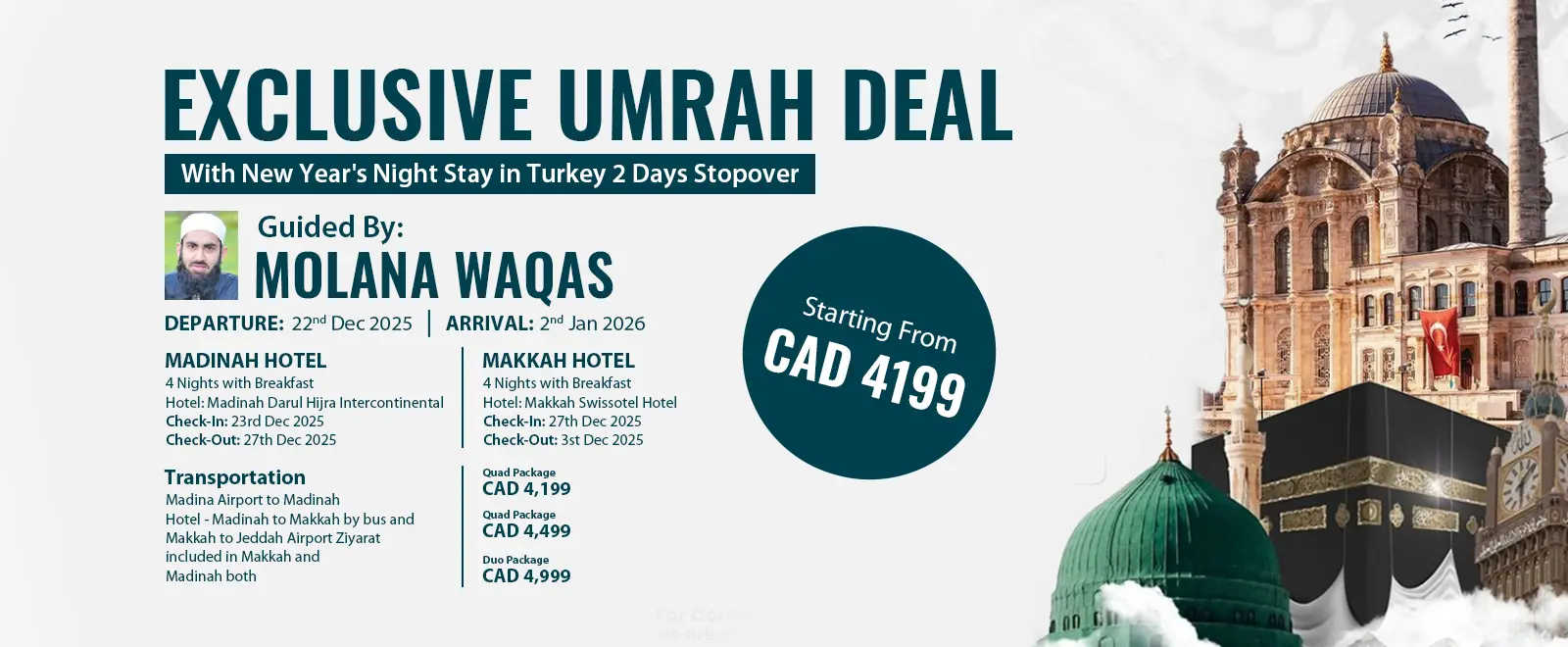 Traveling with us includes ease, comfort and convenience. Our accommodation includes 5-star hotels and amenities, accompanied by experienced scholars. Our services have been carefully chosen and refined to allow each person in our tour to experience the most exhilarating and life-changing journey of their life. We are located in Toronto, Canada and can make arrangements to take tours from various cities in Canada.